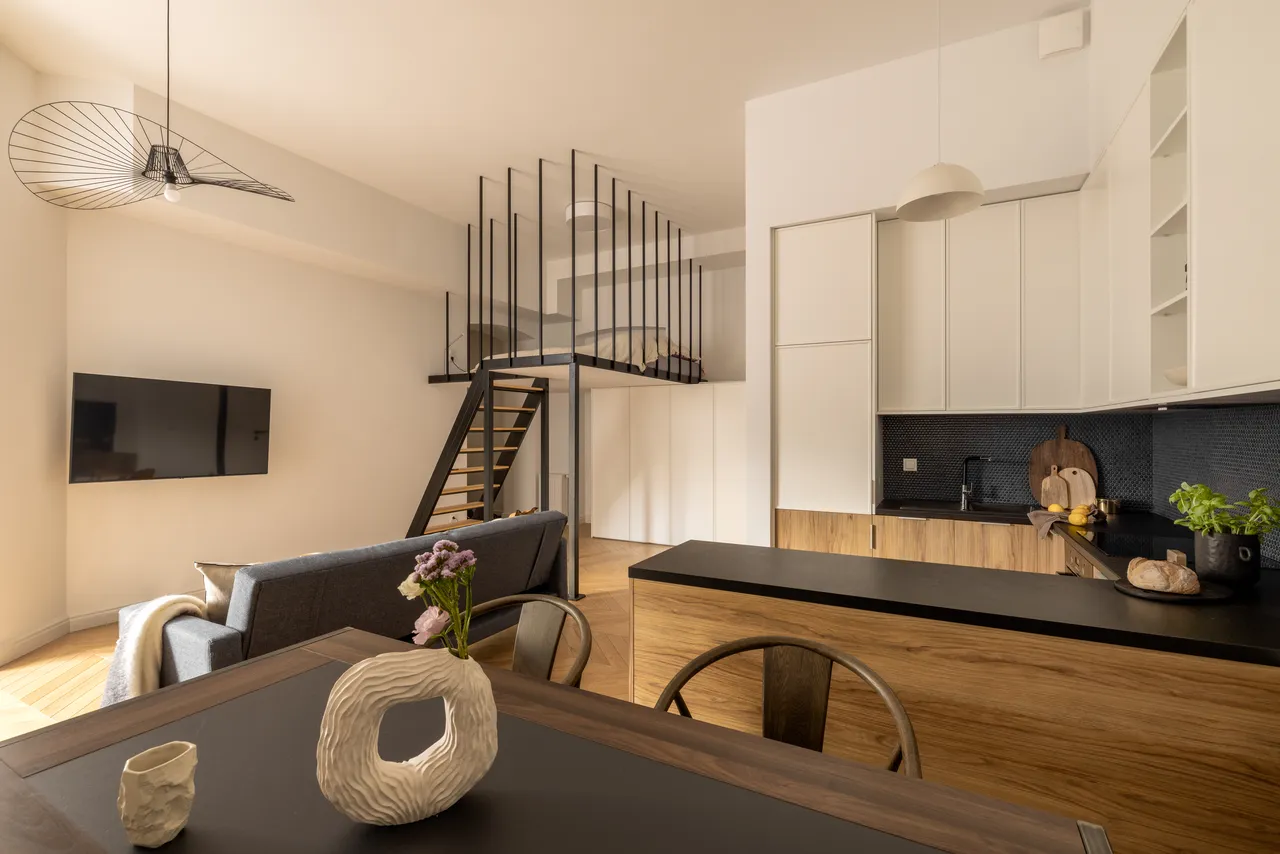 Na podłodze w części dziennej znalazła się ponadczasowa, francuska jodełka – niczym z francuskiej kamienicy. Jest tu również designerskie oświetlenie, w tym najmodniejsza na Instagramie lampa-kapelusz, czyli słynna, wisząca lampa Vertigo, francuskiej marki Petite Friture.